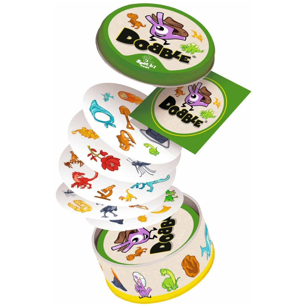 A Dobble Dinók egy pörgős, zsebre vágható kártyajáték, amelyben a figyelem és a reflexek döntenek. Minden kártyán 8 különböző dinó vagy dinós tárgy szerepel, és a szabály zseniálisan egyszerű: bármelyik két kártyán mindig pontosan egy azonos szimbólum van. A feladatod csupán annyi, hogy ezt te vedd észre először – és mondd be hangosan!