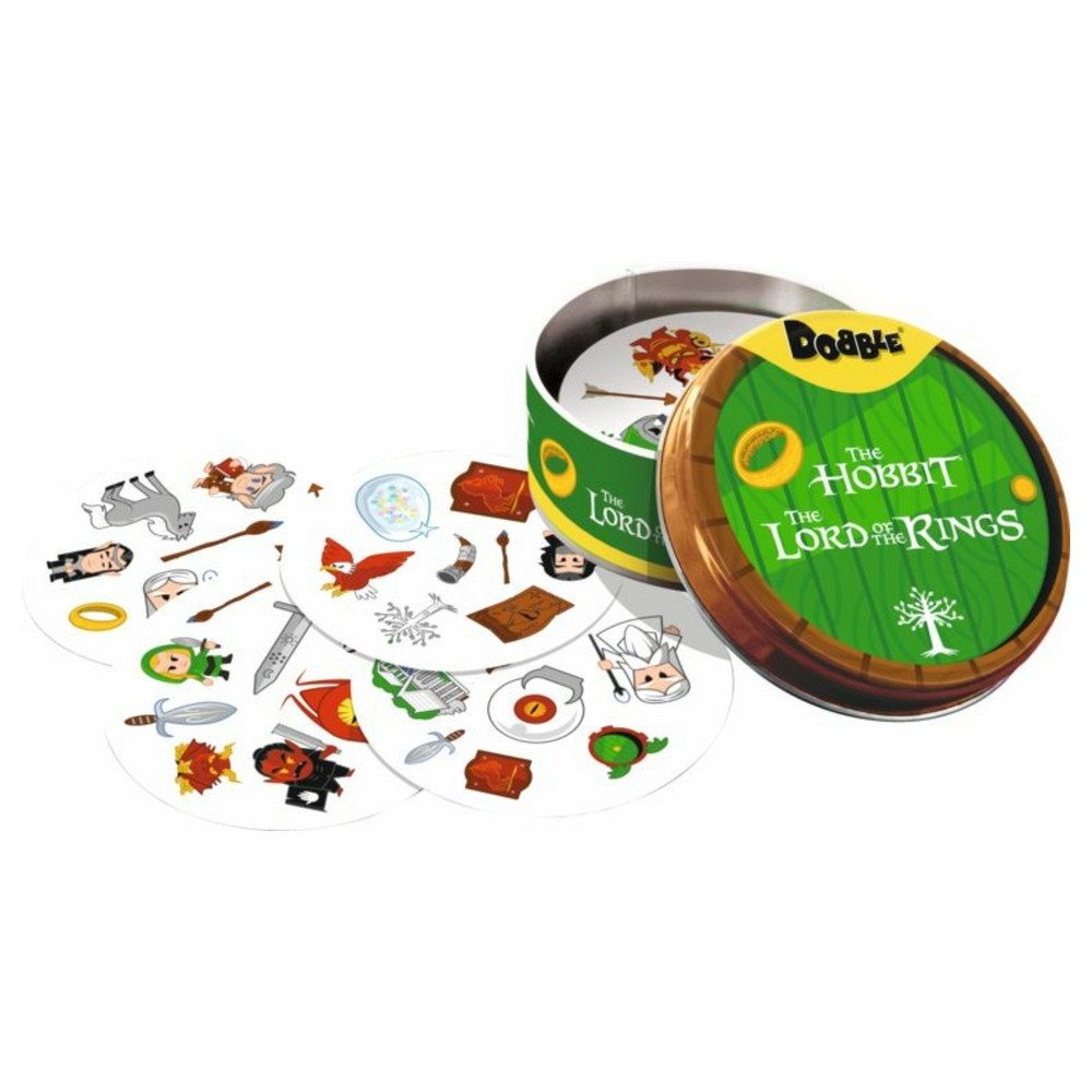 Dobble – A Gyűrű nyomában a gyorsaság és a felismerés villámgyors partijátéka Középfölde ikonikus szereplőivel és jelképeivel. Találd meg te először a közös szimbólumot (Frodó, Samu, Gandalf, Legolas, Smaug, az Egy Gyűrű…), mondd be hangosan, és szerezz előnyt az 5 minijáték egyikében!