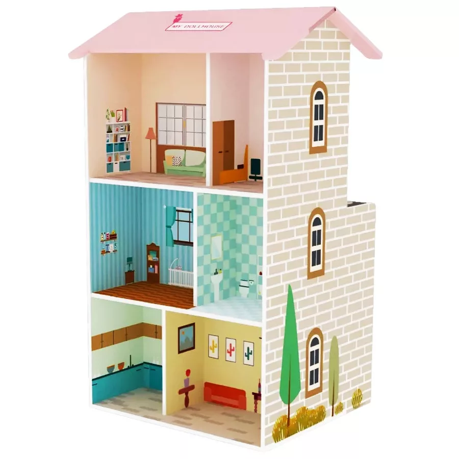 A másik oldal egy részletes, 6 helyiségre osztott babaház, ahol a gyermekek saját történeteket alkothatnak, szereplőket mozgatva a különböző terek között. A hétköznapi helyzetek, családi jelenetek vagy fantáziadús mesék mind-mind életre kelhetnek a szobákban.