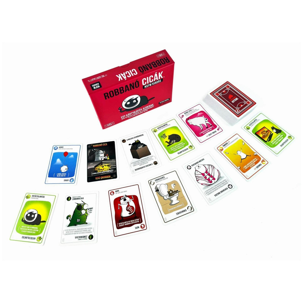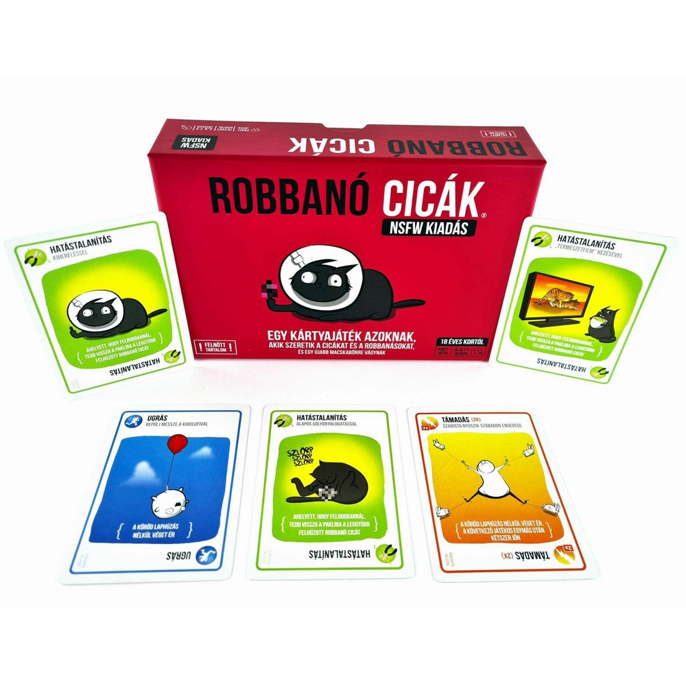 Robbanó cicák – NSFW kiadás: fergeteges, felnőtteknek szóló partijáték, ahol mindent megteszel, hogy ne húzz robbanó cica kártyát! Lopj lapot, akadályozd az ellenfeleket, nézz a pakli tetejébe és keverd meg a sorsot – a röhögés garantált.
