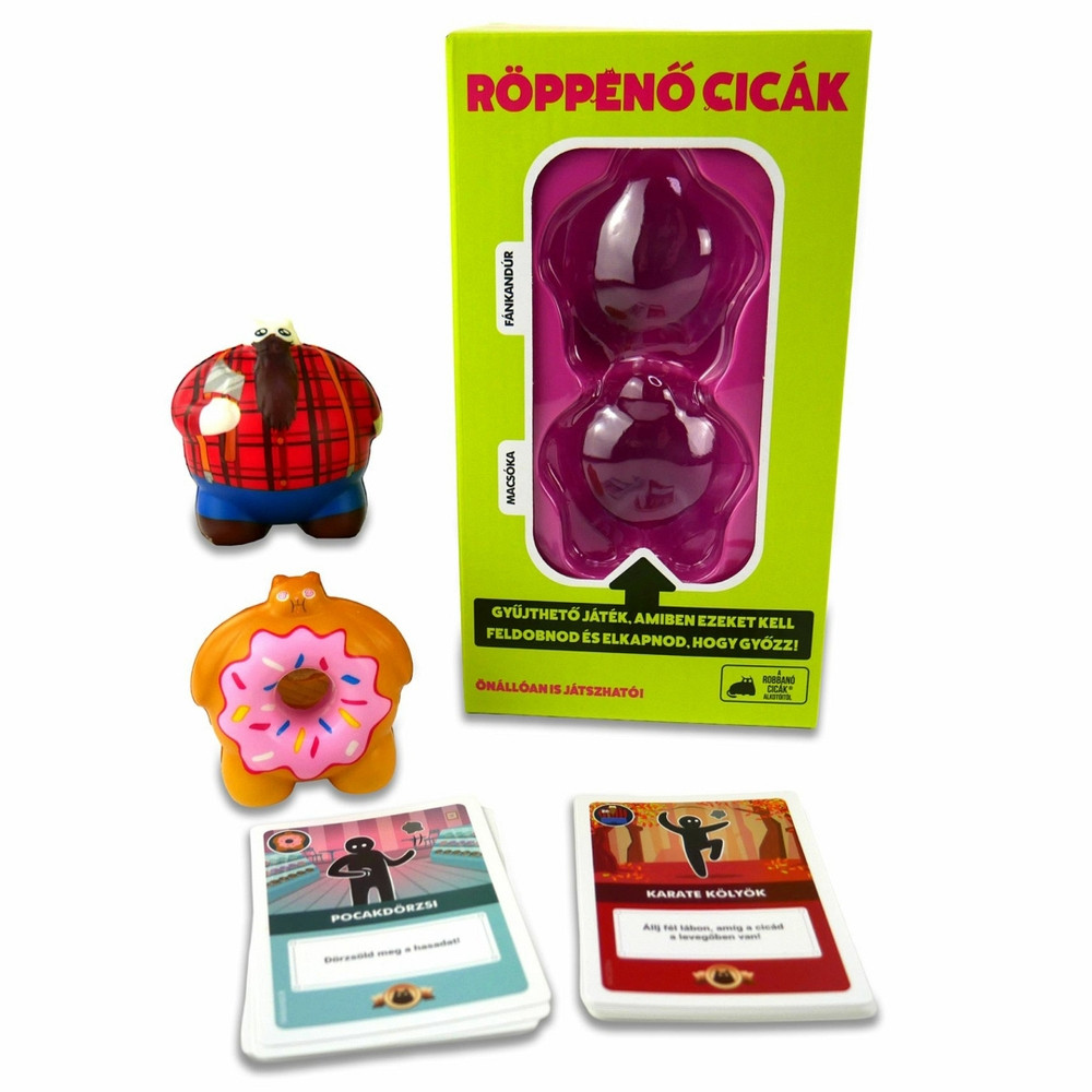 Röppenő cicák: Duopakk – Macsóka és Fánkandúr – két új, puha röppenő cica és 24 friss mutatványkártya, amelyekkel önálló partijátékot kapsz, de az alapjátékkal kombinálva még több káosz és nevetés vár.