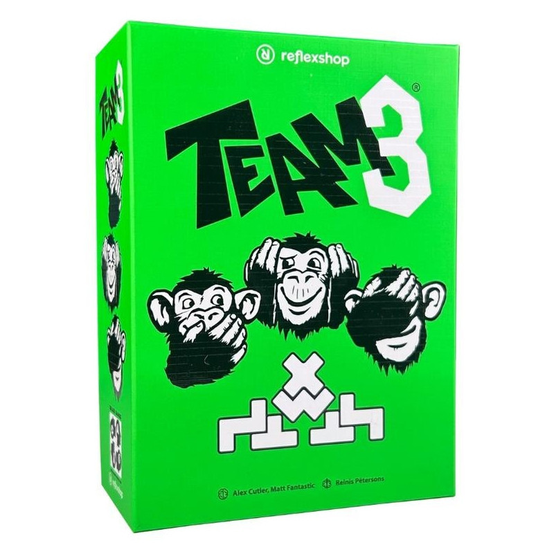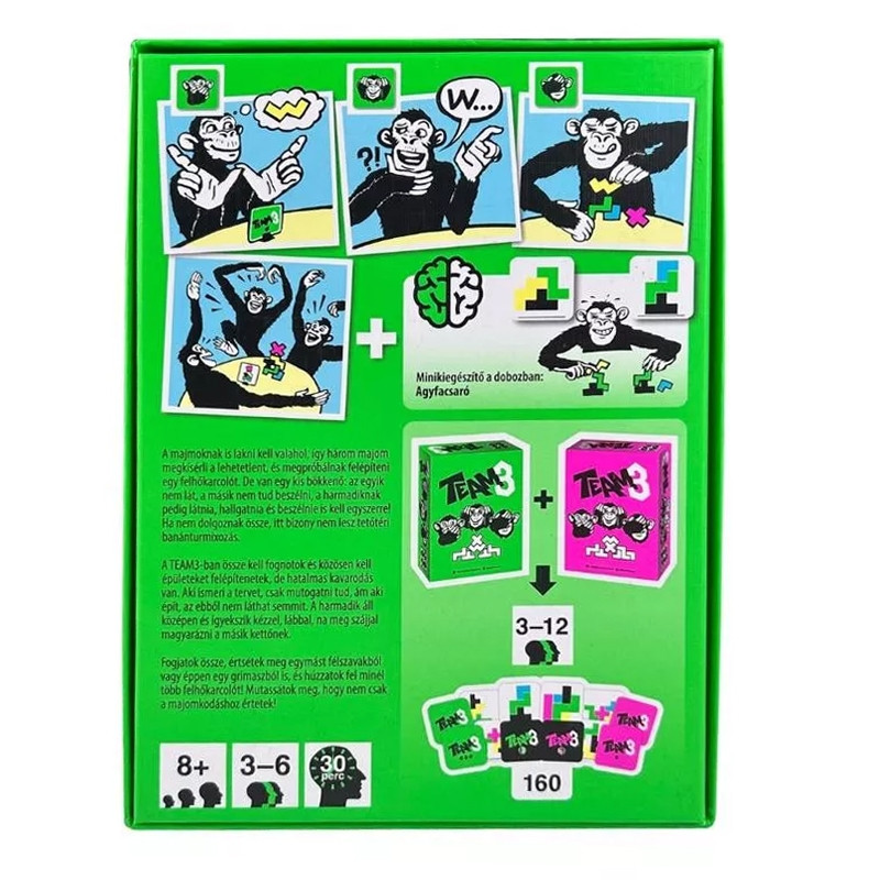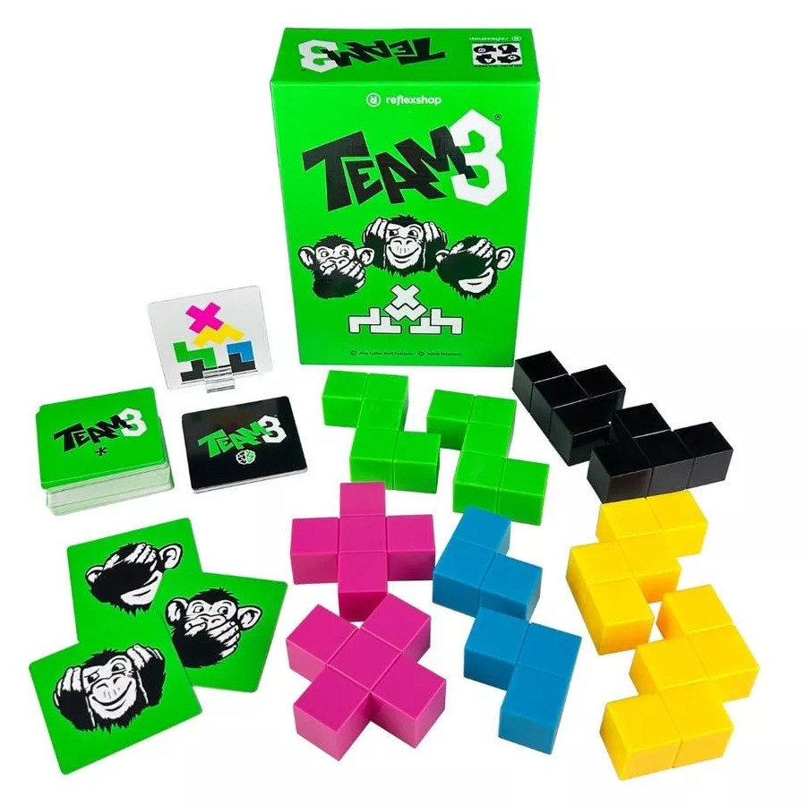 TEAM3 – kooperatív parti- és ügyességi játék, ahol hárman egyetlen felhőkarcolót húztok fel 3 perc alatt: a Tervező csak mutogat, a Felügyelő tolmácsol, az Építő pedig csukott szemmel rakja az elemeket. Sikerhez pontos kommunikáció, bizalom és villámgyors csapatmunka kell! Játszható 3–6 fővel, két külön dobozban (zöld / rózsaszín) eltérő tervrajzokkal és minikiegészítőkkel.