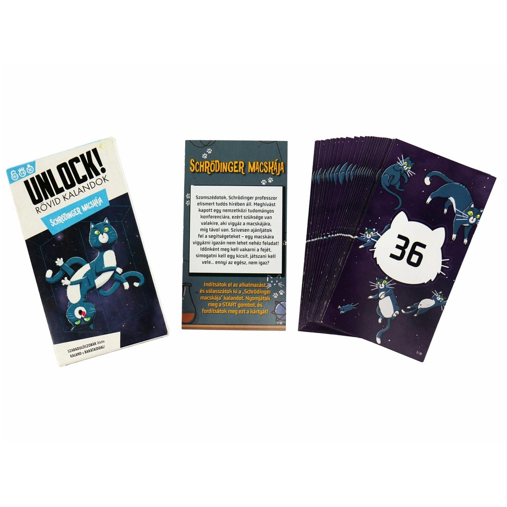 Segítsetek kijutni Schrödinger macskájának az univerzumok szövevényéből! Az Unlock! – Rövid kalandok: Schrödinger macskája egy zsebre vágható, közepes nehézségű, kooperatív társasjáték, amely a szabadulószobák izgalmát hozza el kártyapakli formában. A játékosok együtt oldják meg a feladatokat, hogy továbbléphessenek a történetben és megfejtsék a rejtélyeket.