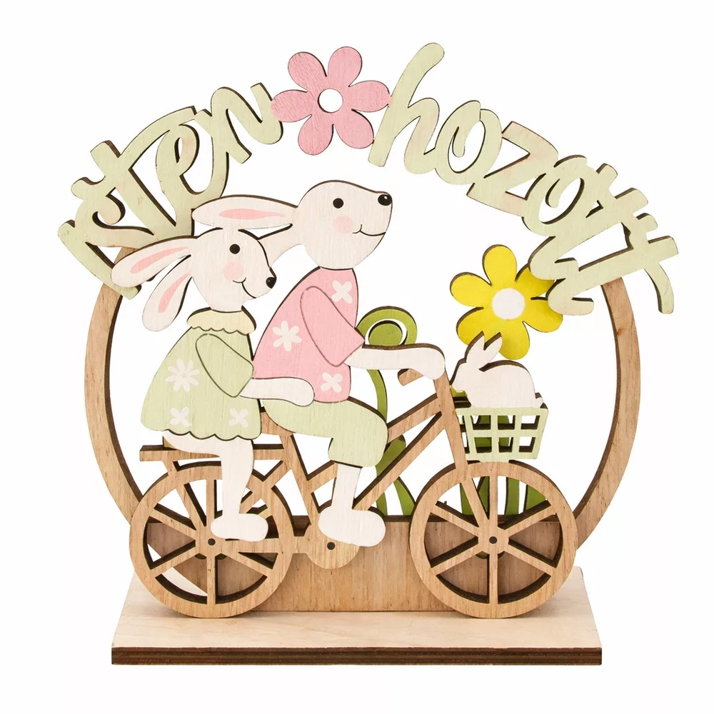 Az Asztaldísz – Isten hozott (bicikliző nyuszik) vidám húsvéti dekoráció, amely kedvesen fogadja az érkezőket. Szépen mutat az előszobában, az asztalon vagy egy polcon, és tavaszias hangulatával könnyen a szezon egyik kedvenc dísze lehet.
