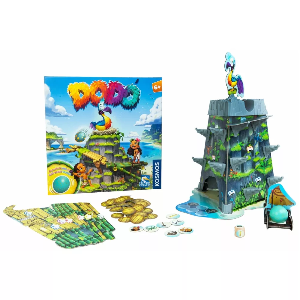 Mentsd meg a szent tojást! A Dodó egy vidám, pörgős, kooperatív társasjáték, ahol egy ügyetlen dodó tojása megindul a hegyoldalon, ti pedig versenyt futtok az idővel, hogy hidakat építve biztonságos utat készítsetek neki a kikötőben várakozó csónakig.