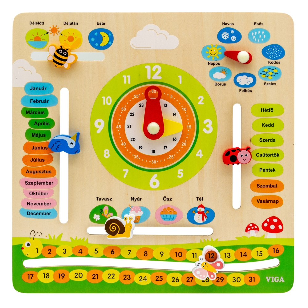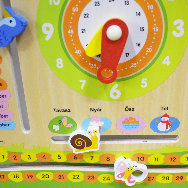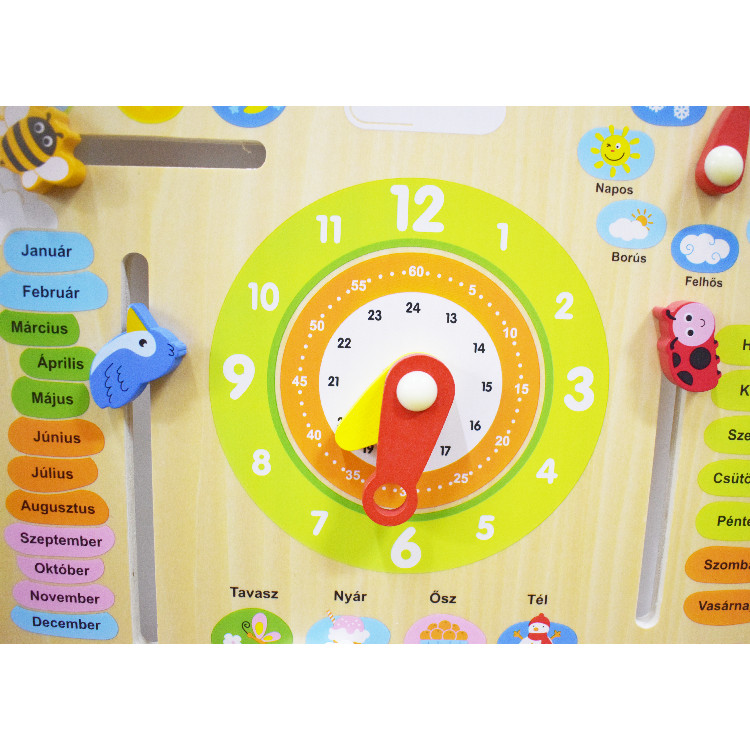 Minőségi oktatási eszköz, mellyel lehetőség adódik az évszakok, hónapok, napok, napszakok, időjárás és az óra szemléletes tanulására illetve oktatására. Csoportos oktatásra(óvoda, iskola) kitűnően hasznosítható, de alkalmas otthoni egyéni fejlesztésre is. Egy évet 12 hónapra bont a naptár, utána megtanítja a négy évszakot, a hét napjait sorrendbe helyezi ( Hétfőtől-Vasárnapig). Bemutatja  a fontosabb napszakokat szemléltetve a főbb tevékenységekkel. Lehetséges időjárás változásokra megtanítja a gyermeket. A hónap napjait könnyen be lehet jelölni a mutató segítségével. Az óra és perc elsajátításában látványos faóra áll rendelkezésre. A termék színvilága hagyományos négy alapszínre épül. A naptár akár falra is szerelhető két csavar segítségével.