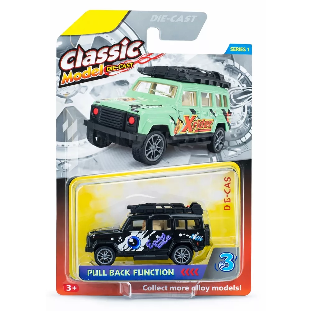 A fekete fém Off-Road autó vagány, „kommandós” hangulatú terepjáró a kisautók között. Visszahúzós kivitelű, ezért gyorsan mozgásba lendül, a markáns forma pedig tökéletes bevetős történetekhez, üldözésekhez és gyűjtéshez is.