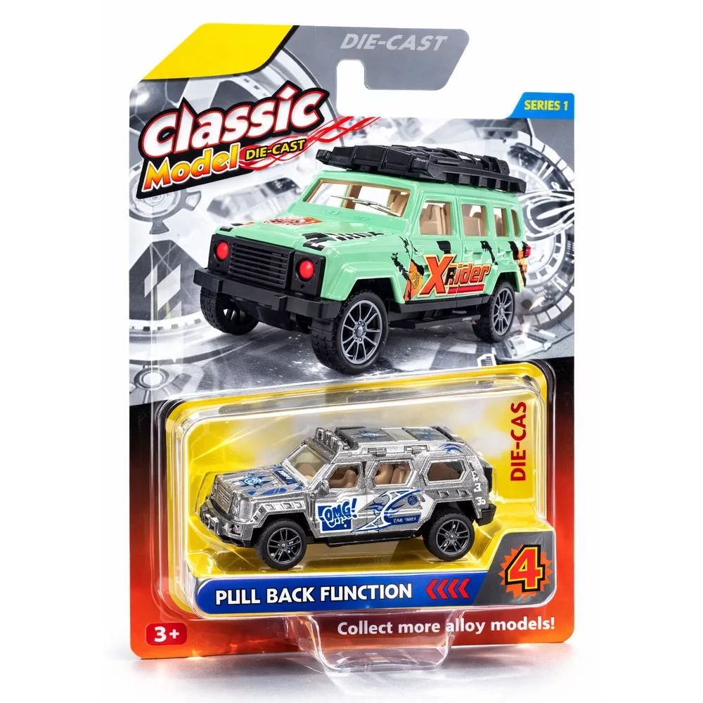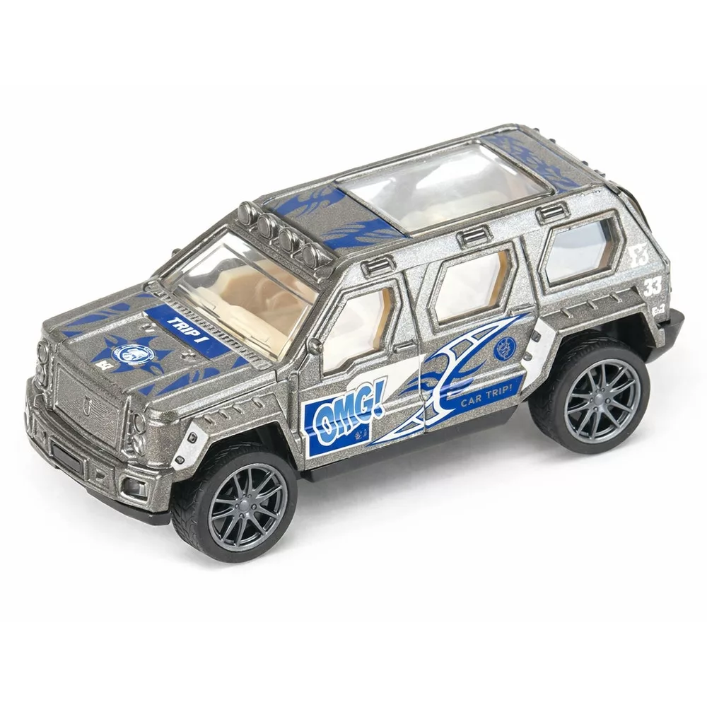 A szürke fém Off-Road autó igazi klasszikus terepjárós hangulatot hoz a játékba. Visszahúzós kivitelének köszönhetően könnyen mozgásba hozható, a részletes kialakítás pedig inspirálja a járműves történeteket és a hosszú „túrákat” a szobában.