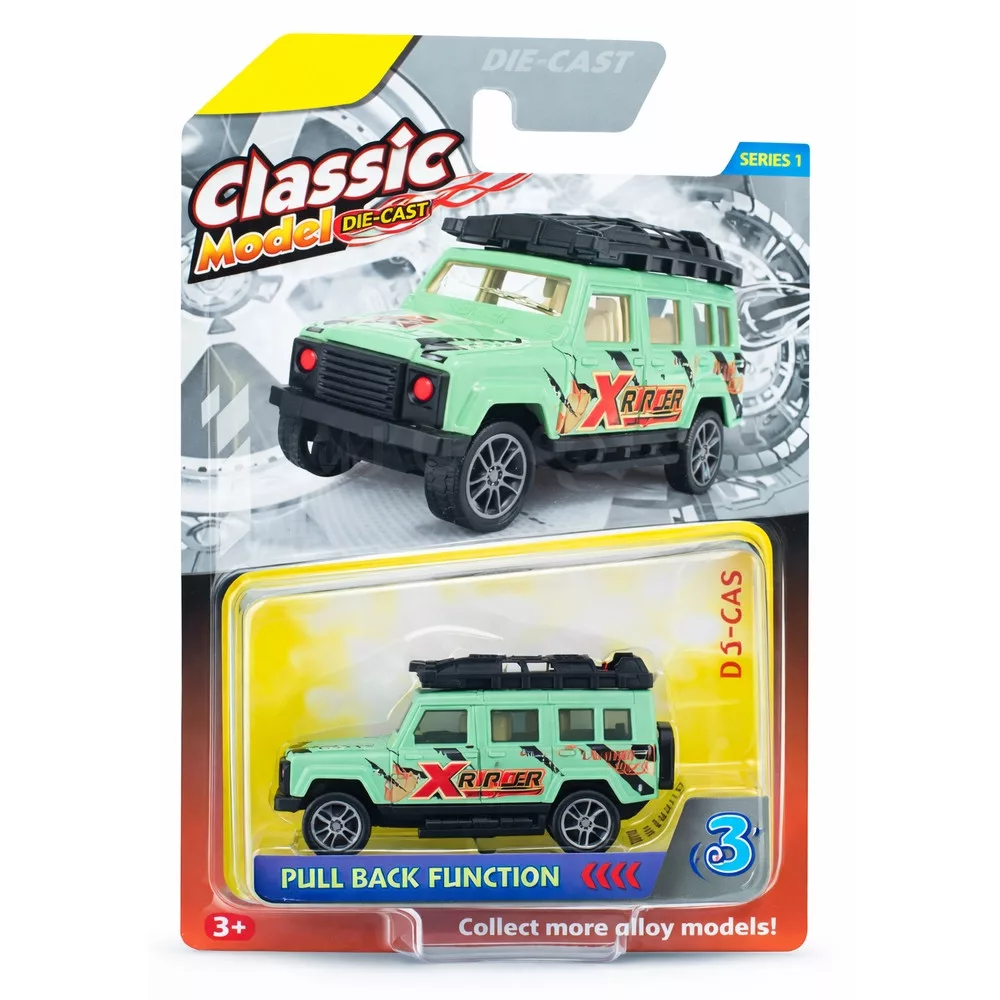 A zöld fém Off-Road autó igazi felfedezőjárgány a képzeletbeli expedíciókhoz. Visszahúzós kivitelű, ezért egy mozdulat után már gurul is, a terepjárós részletek pedig még élvezetesebbé teszik a járműves szerepjátékokat.