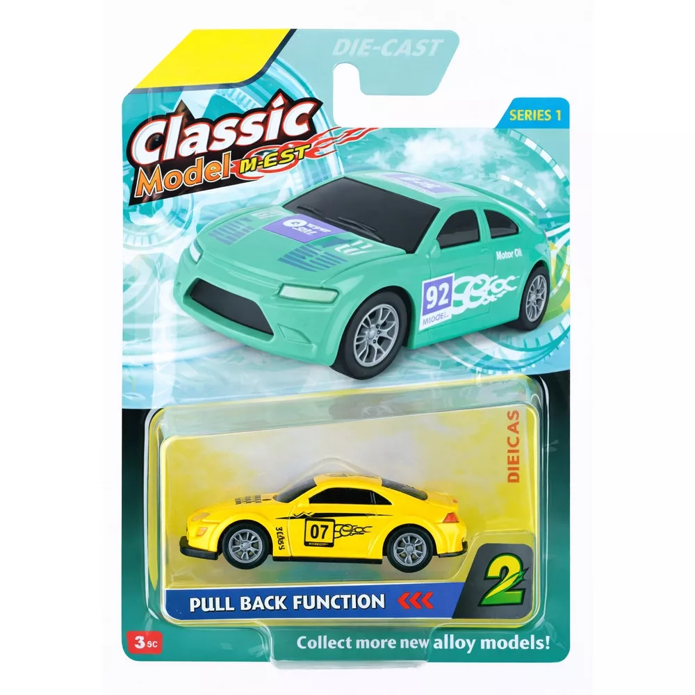 A sárga fém sportautó igazi kedvenc a kis autórajongóknak: lendületes forma, vagány versenycsíkok, kézbe simuló méret. Visszahúzós kivitelének köszönhetően egy mozdulattal indulhat a száguldás, ideális otthoni versenypályákhoz és útközbeni játékhoz is.