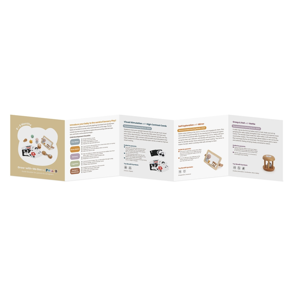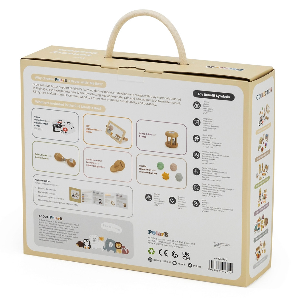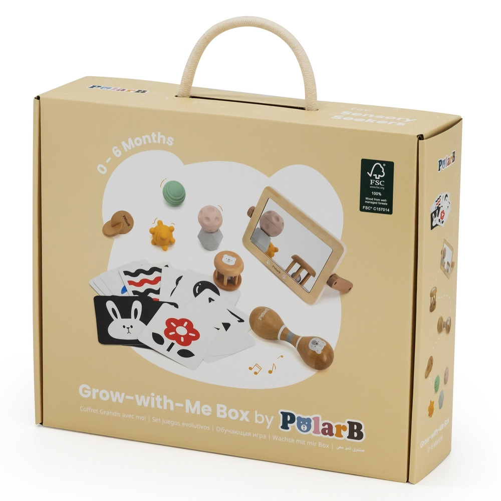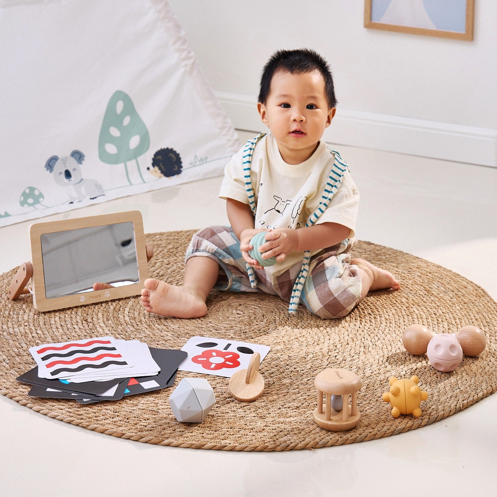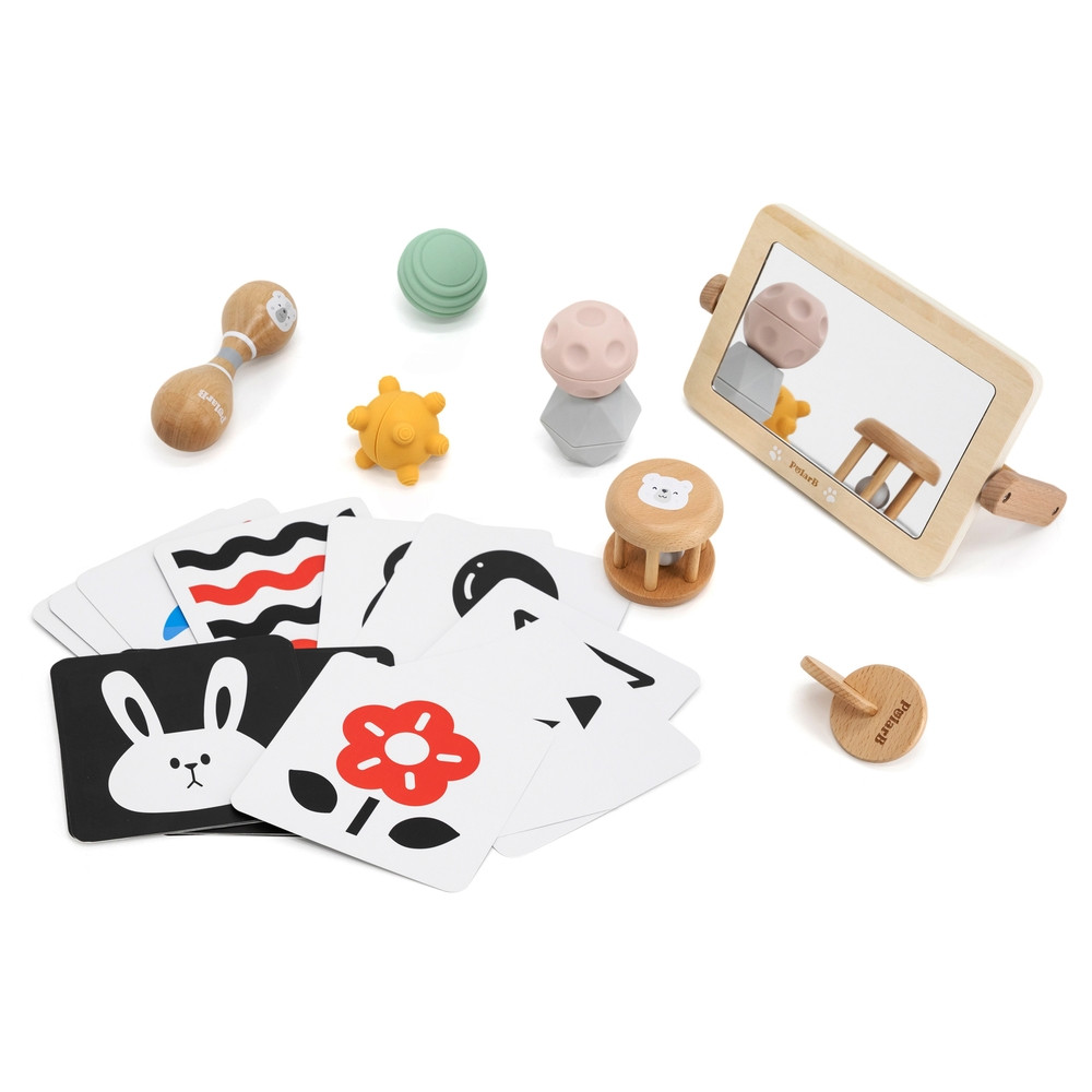 A csomag magas kontrasztú kártyákat, biztonságos babatükröt, gurítható csörgőt, textúrált labdákat és kézügyességet fejlesztő fogó-játékokat tartalmaz, hogy a baba lépésről lépésre fedezze fel az érzékelés világát.