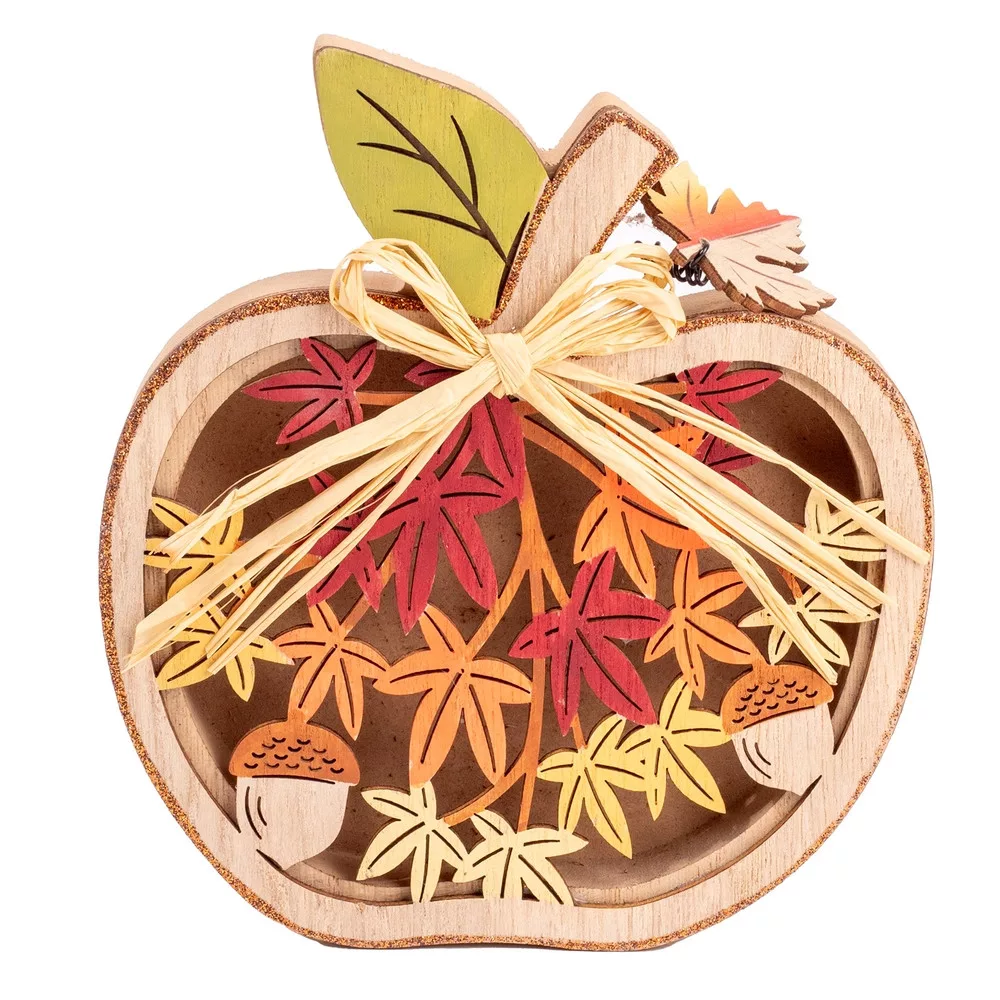 Kedves, őszi hangulatú asztaldísz almaformában, színes falevelekkel és makk motívumokkal. A natúr fa hatás, a meleg őszi árnyalatok és a dekoratív masni együtt igazán hangulatos kiegészítővé teszik a lakásban.