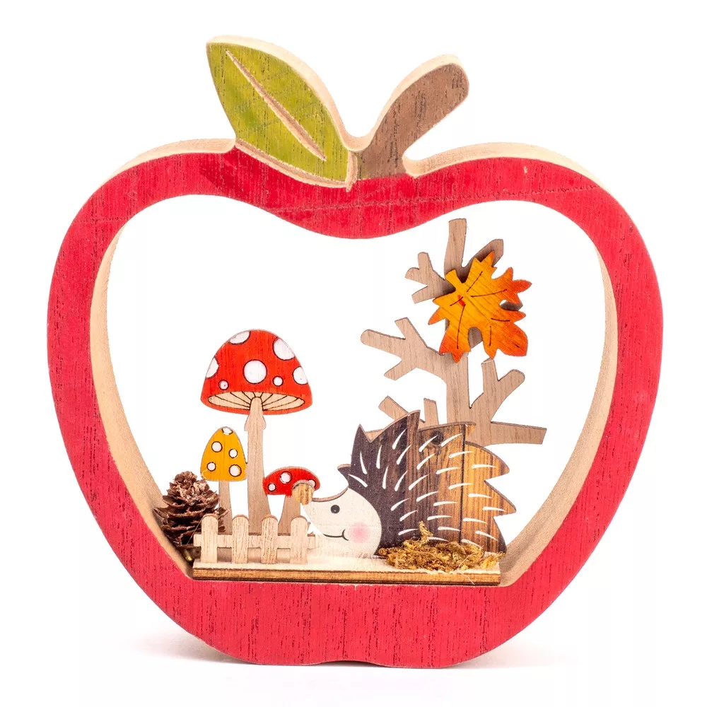 Hangulatos őszi asztaldísz, amelyben az almaforma, a kedves süni, a gombák és a kis fa együtt teremtenek bájos, mesés összhatást. A meleg színek és a természetes fa hatás miatt polcon, komódon vagy szezonális dekorációként is szépen mutat.