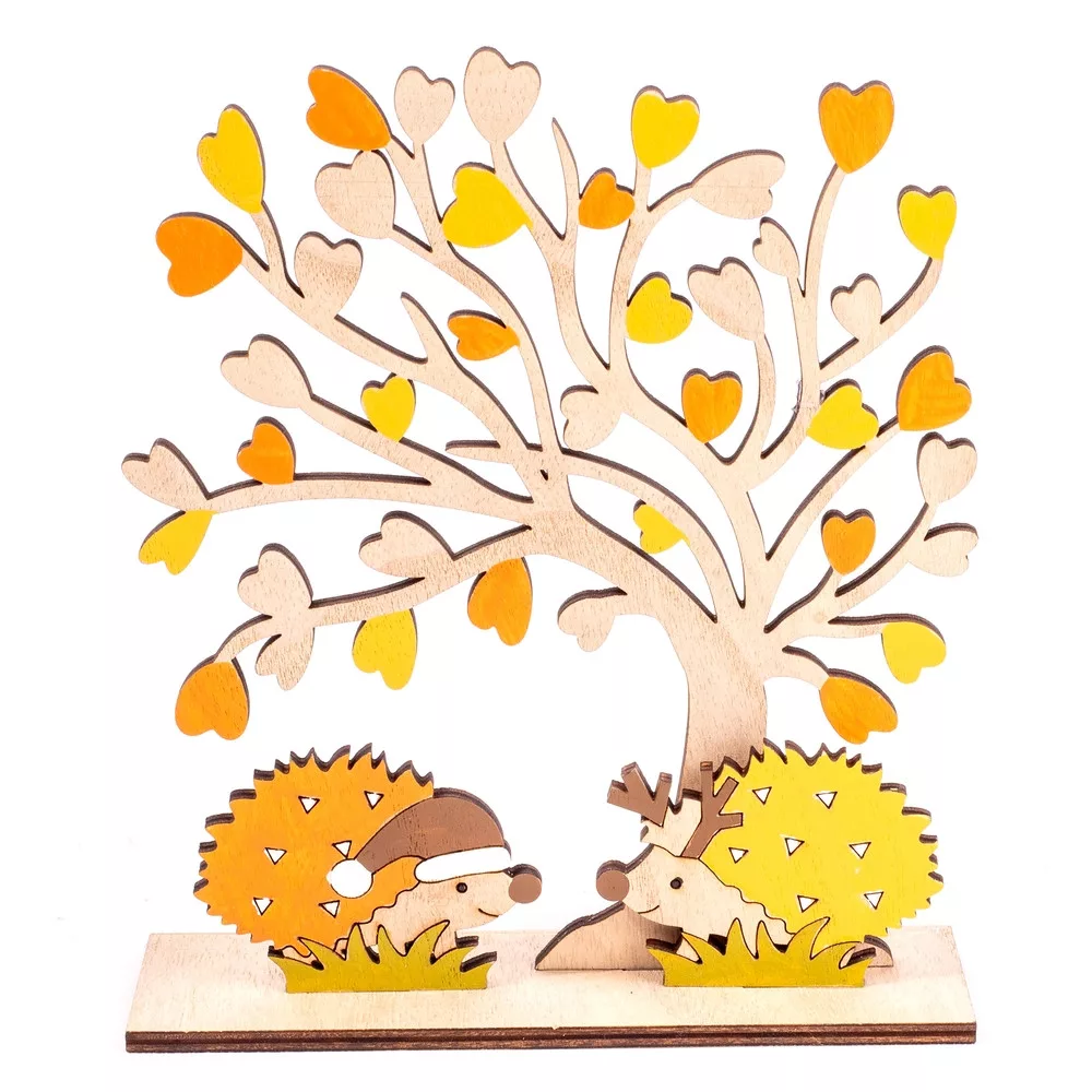 Hangulatos őszi asztaldísz, amelyen a színes levelű fa és a kedves sünik együtt teremtenek bájos, szezonális összhatást. A természetes fa hatás és a meleg őszi árnyalatok miatt polcon, komódon vagy az évszakhoz illő dekorációk között is szépen mutat.
