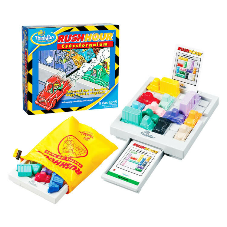 ThinkFun, Rush Hour- csúcsforgalom A doboz tartalma: 40 db feladatkártya a kezdőtől a profi szintig, megoldások, játékszabály, utazózsák, 4 kamion, 11 személyautó, a te piros autód, 1 játékkeret. Kijutni! Ez a cél. A Rush Hour a világ legnépszerűbb tologatós játéka, a logikádat és problémamegoldó képességedet teszi próbára. A Rush Hour egyben az egyik legelismertebb készségfejlesztő játék is. A játék 4 nehézségi szinten (kezdő, gyakorlott, haladó és profi) 40 feladatkártyát tartalmaz. Kezdj neki! Válassz egy feladatkártyát, és az azon látható ábra szerint helyezd el a járműveket a játéktéren. A dugóból egyetlen kijárat van, úgy kell tologatnod a járműveket, hogy szabaddá váljon az ahhoz vezető út a te kocsid előtt. Az autókat nem emelheted fel, csak előre-hátra tologathatod őket. Ha az elejétől kezdve, sorban teljesíted a feladványokat, mire elérsz a profi szintre, képes leszel a legreménytelenebbnek látszó dugókból is kihozni az autódat. Ha mégis úgy látod, hogy menthetetlenül beragadtál, csak vedd ki a kocsikat, és tedd fel őket a kezdőpozícióba. Indítsd be a motorokat, és jöhet a tologatás!