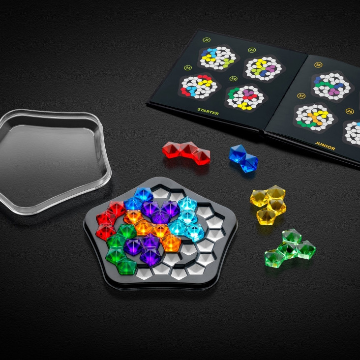 A Smart Games – IQ Deluxe Pentagon az IQ Deluxe kollekció kifinomult darabja: szólójátékos logikai rejtvények gyűjteménye luxus fekete–arany csomagolásban, amely egyszerre stílusos és kihívást adó.