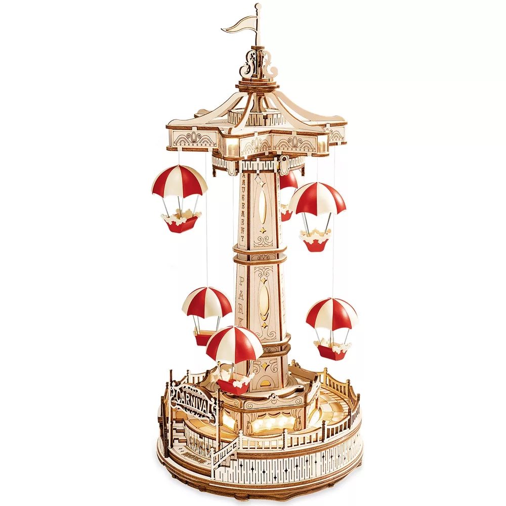 Ez a ROKR 3D fa puzzle egy különleges, vidámparki ihletésű mechanikus zenedoboz, amely az ejtőernyős torony látványát idézi meg. Az elkészült modell egyszerre dekoratív, zenélő és mozgó szerkezet, így építés után is izgalmas látványt nyújt.