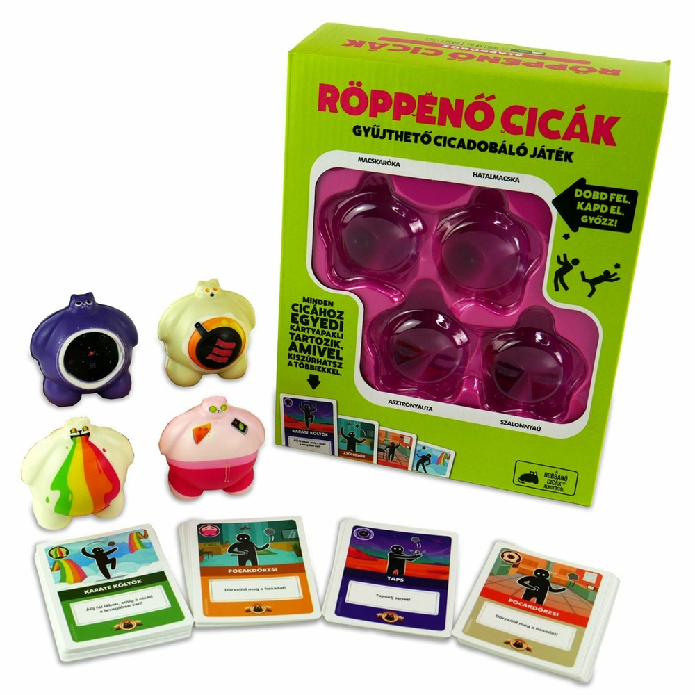 Dobd fel a cicát, teljesíts egymás után több mutatványt, és kapd el, mielőtt padlót fog! A Röppenő cicák lendületes, nevetést garantáló partijáték, amelyben a puha, nyomkodható főszereplők – például Macskaróka, Hatalmacska, Asztronyauta és Szalonnyaú – kifejezetten röppentésre születtek.