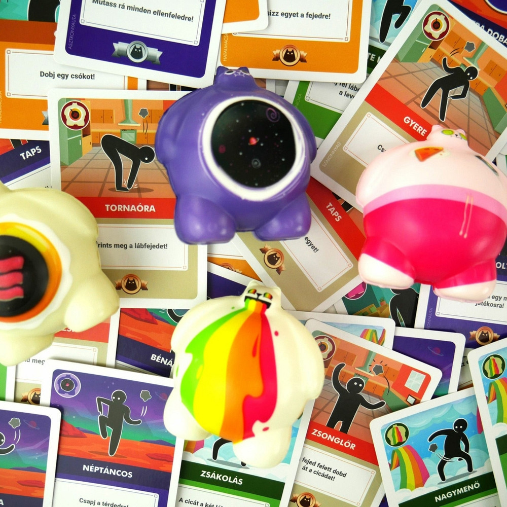 Röppenő cicák – cicaröptetés mesterfokon egy pörgős, röhejesen vicces partijáték, ahol puha, nyomkodható cicákat dobsz a levegőbe, miközben őrült mutatványkártyákat teljesítesz – majd el is kell kapnod a cicát, mielőtt földet ér.