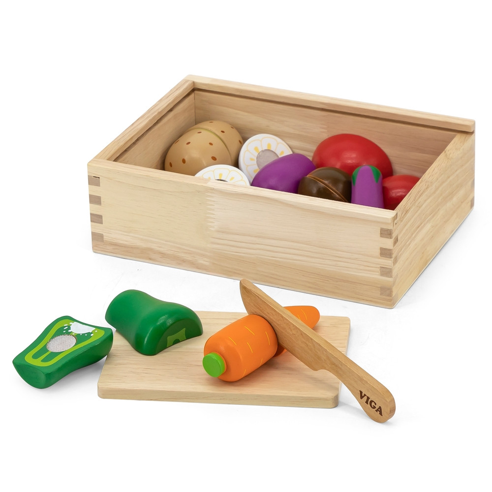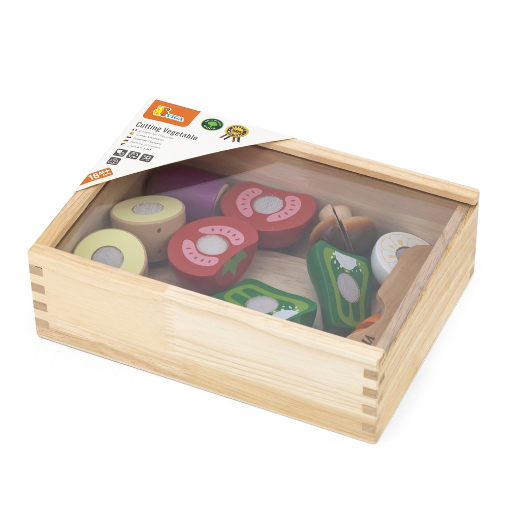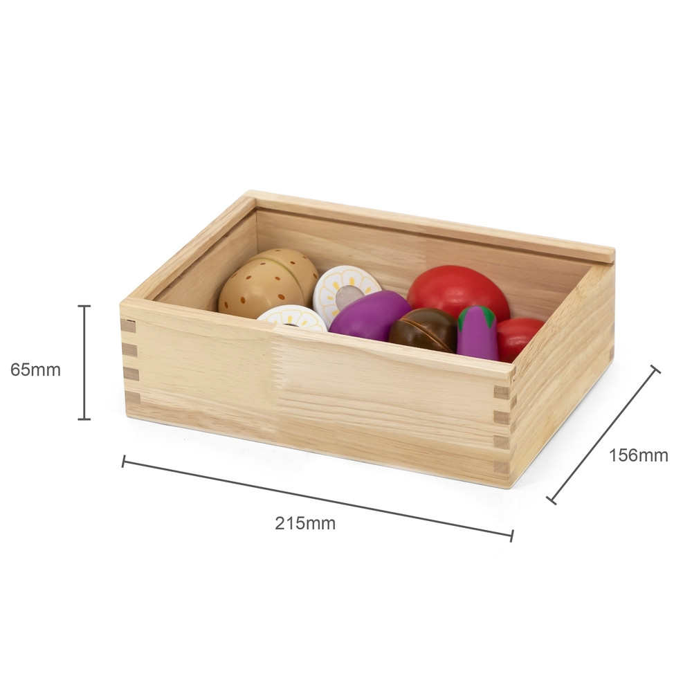 A csomag egy vágódeszkából, egy játékkésből és egy fa tárolódobozból áll, átlátszó akril tolófedéllel az egyszerű pakolásért. A 7 darab fa zöldség mind tépőzáras, ezért félbevágás után könnyedén újra összeilleszthető.