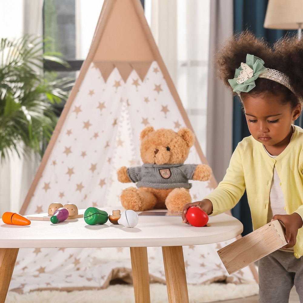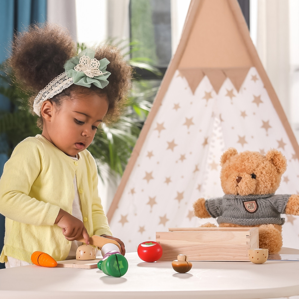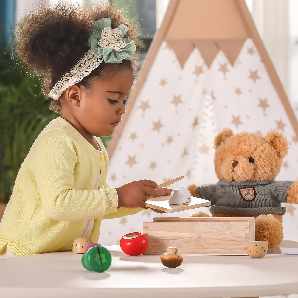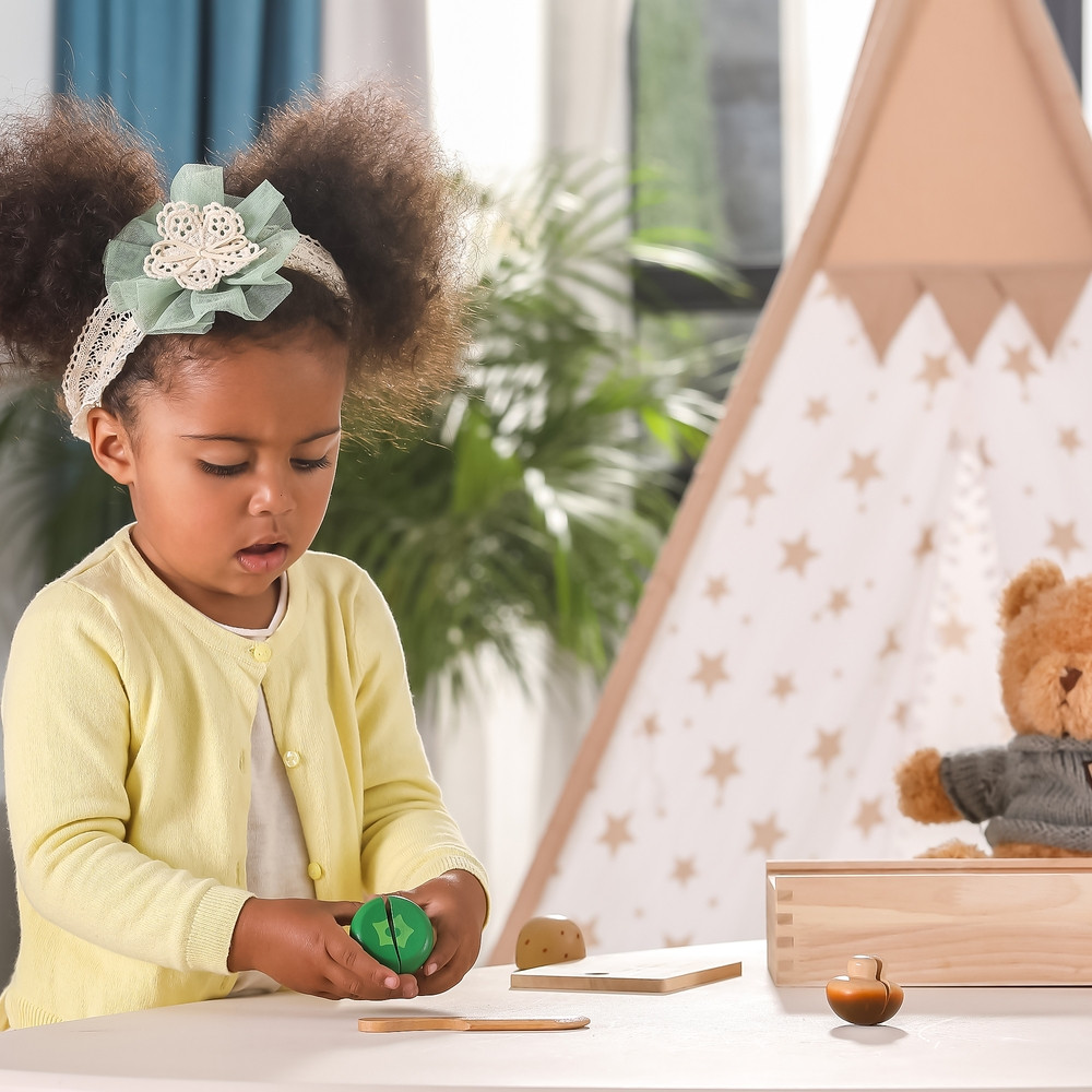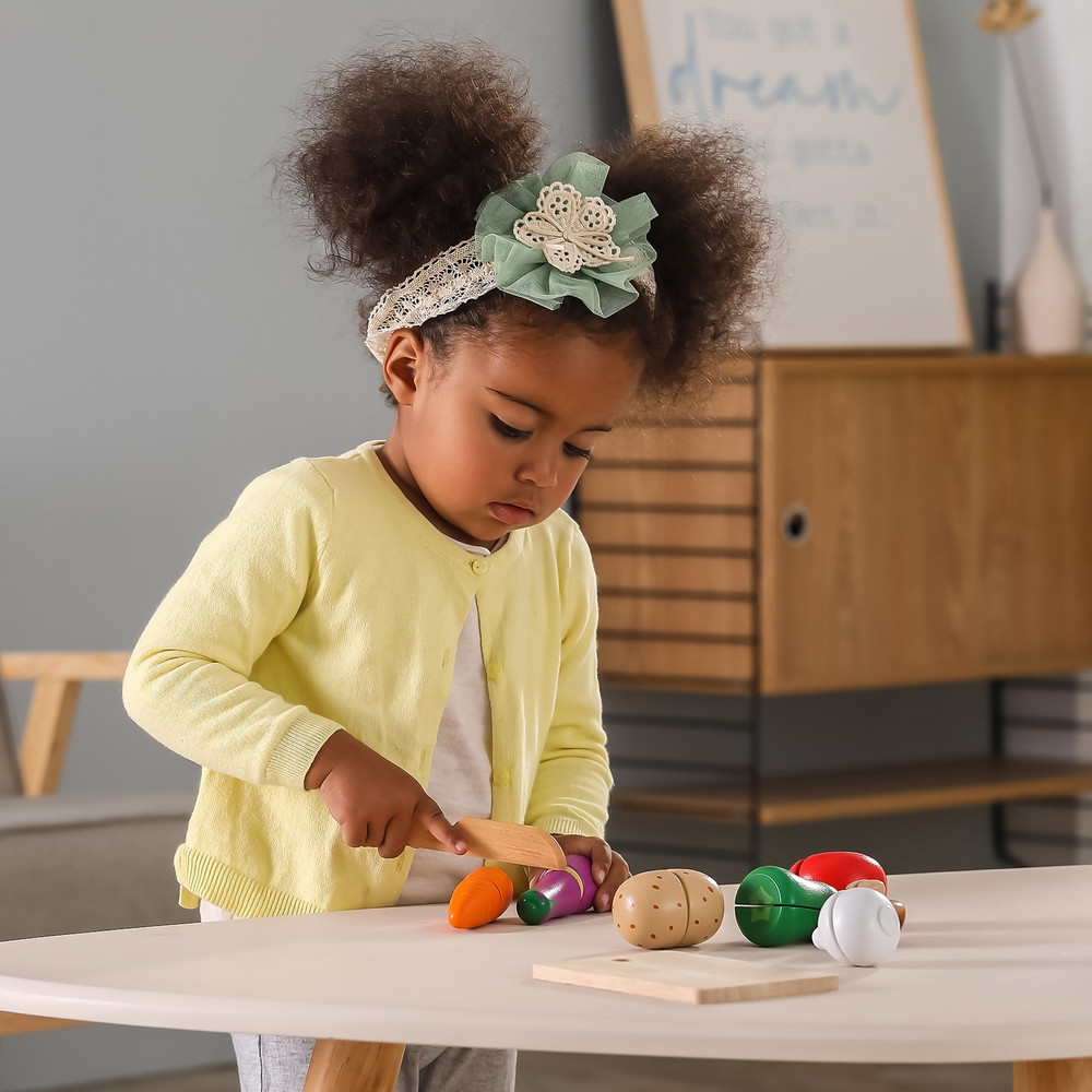 A szeletelés és az összeillesztés erősíti a finommotorikát, a kétkezes együttműködést és a kéz–szem koordinációt. A szerepjáték – bevásárlás, főzés, tálalás – során bővül a szókincs, fejlődik a kommunikáció és a sorrendiség megértése, miközben beszélgetést indíthat az egészséges táplálkozásról is.